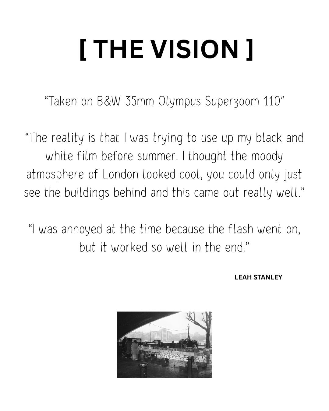 'The reality is that I was trying to use up my black and white film before summer. I thought the moody atmosphere of London looked cool, you could only just see the buildings behind and this came out really well. I was annoyed at the time because the flash went on, but it worked so well in the end.'